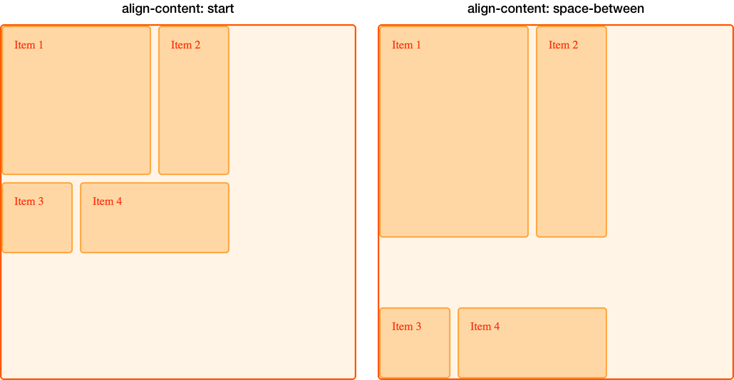 Dans l'image qui suit, on a a placé une grille en utilisant align-content: start et une autre grille qui utilise align-content: space-between. On peut voir la façon dont les objets 1 et 2 (qui s'étalent sur deux lignes) ont gagné en hauteur pour combler l'espace entre les pistes.