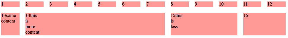 Цель состоит в том, чтобы превратить это в демонстрационную сетку из двух рядов на двенадцать столбцов сетки (grid) - верхний ряд, демонстрирующий размер отдельных столбцов, второй ряд - некоторые области разного размера в сетке.